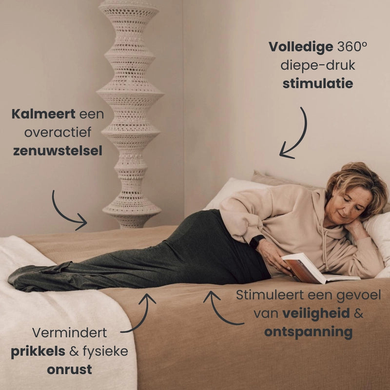 Als slaapcoach raad ik het dagelijks aan. De constante druk helpt het lichaam ontspannen, waardoor je sneller in slaap valt, dieper slaapt en minder vaak wakker wordt. Voor mensen met stress, overprikkeling of een onrustig lijf is dit echt een gamechanger."