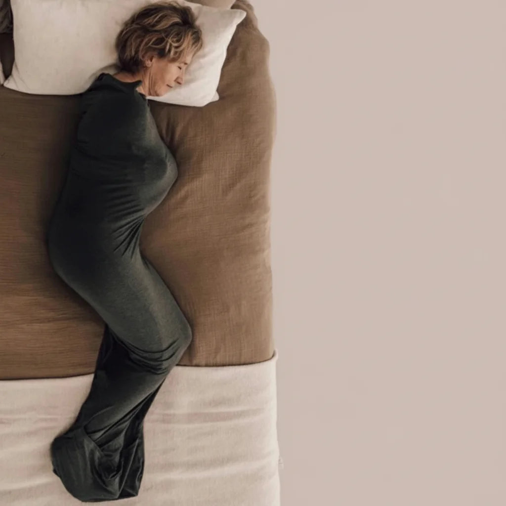 Hoe dat kan? Het is gemaakt van ultra-stretchy, ademende rayon – een milieuvriendelijke stof die aanvoelt als zijde en geen warmte vasthoudt. Dankzij de slimme voetenflip bepaal je zelf hoe warm je het hebt. Zo slaap je zelfs op zomerse nachten comfortabel door, zonder dat plakkerige gevoel van een verzwaringsdeken.